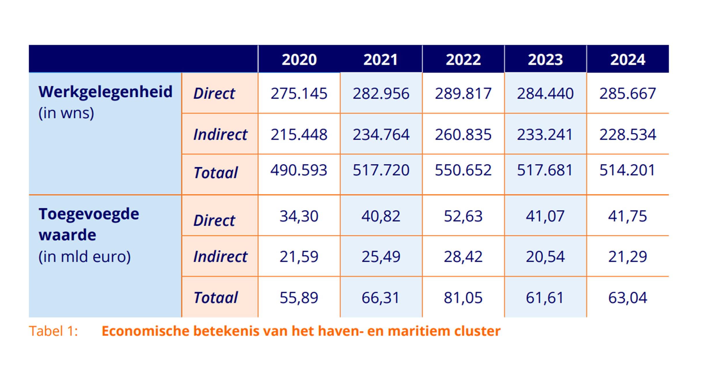 Het totale maritieme cluster in Nederland genereert in 2024 ruim € 63 miljard toegevoegde waarde (direct en indirect). Dit komt neer op zo’n 5,6 procent van het bruto binnenlands product van 2024. Daarnaast zorgt de sector voor een totale werkgelegenheid van 514.201 werknemers in 2024 ofwel 5,0% van de Nederlandse werkgelegenheid. De werkgelegenheid en toegevoegde waarde nemen ten opzichte van 2023 met respectievelijk 0,7% af en 2,3% toe (zie tabel 1).