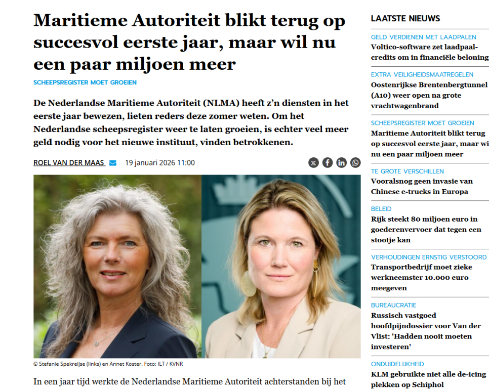 Nieuwsblad Transport: De Nederlandse Maritieme Autoriteit (NLMA) heeft z’n diensten in het eerste jaar bewezen, lieten reders deze zomer weten. Om het Nederlandse scheepsregister weer te laten groeien, is echter veel meer geld nodig voor het nieuwe instituut, vinden betrokkenen.